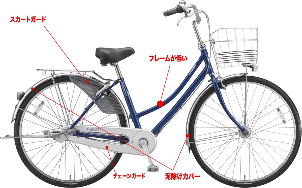 タイヤ上部の泥除けガード、チェーンガードにより、はね上った泥水やズボンの裾などが汚れない。また後輪上部につく「スカードガード」を標準装備している自転車は、女性は大助かりの機能の一つです。