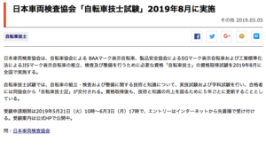 日本車両検査協会は、自転車協会による BAAマーク表示自転車、製品安全協会によるSGマーク表示自転車および工業標準化法によるJISマーク表示自転車の組立、検査及び整備を行うために必要な資格「自転車技士」の資格取得試験を2019年8月に全国で実施する。自転車技士試験では、自転車の組立・検査および…(続きはこちら)
