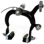 クロスバイク、マウンテンバイクに搭載されているケースが多いですね。この形式は前輪も後輪も同じブレーキ型を搭載しているケースがよく見られます。この場合はメンテナンスしやすくするため、ブレーキをワンタッチで外せる機能がついています。ブレーキアーム上部にフック(呼名:アーム/バナナ)があると思いますので、V型ブレーキの両側を手で挟んで幅寄せ、ワイヤーを緩めると…あら簡単フックからワイヤーがスポッと取りやすくなります取って下さい。