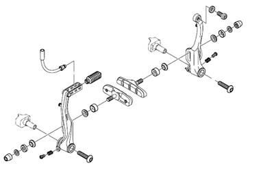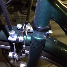 シティサイクル前輪によく付いているブレーキ部品ですね。ブレーキワイヤーを触らなくても、ブレーキシューのボルトを緩めてズラしながら交換出来る場合が多いですが、難しそうであれば、タイヤを跨いでいる銀色の”ひずめ”形状のものと、ワイヤーが繋がっているボルト部分のネジを緩め、ワイヤーをリリースします。