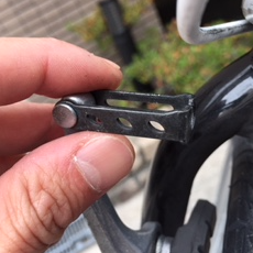 シティサイクル前輪によく付いているブレーキ部品ですね。ブレーキワイヤーを触らなくても、ブレーキシューのボルトを緩めてズラしながら交換出来る場合が多いですが、難しそうであれば、タイヤを跨いでいる銀色の”ひずめ”形状のものと、ワイヤーが繋がっているボルト部分のネジを緩め、ワイヤーをリリースします。
