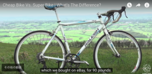 一方、白い自転車は英国の老舗ブランド「RELEIGH(ラレー)」のスポーツバイク。映像では『eBayで90ポンド(15000円くらい)で買ったんだ』と言っている。ちょっとモデルが不明なのだが、おそらくクロモリフレームで市販されているロードバイクでも一般的な車両(7-8万くらい?)なのだろう。オシャレで綺麗なロードバイクである。