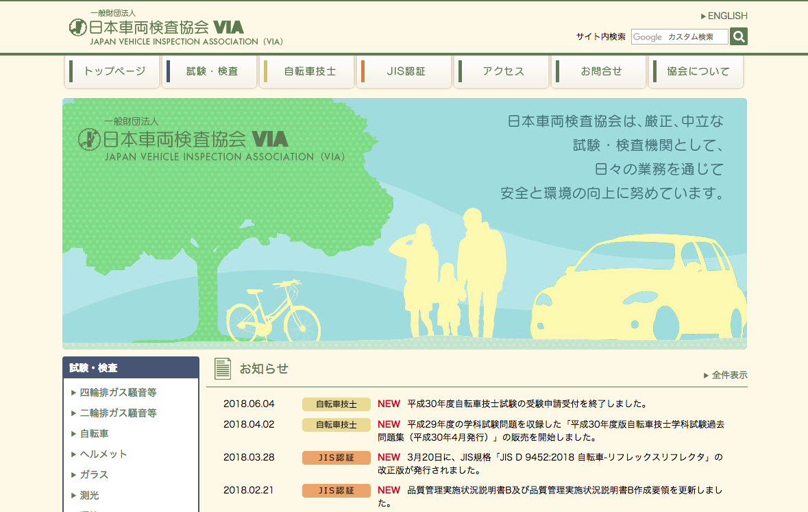 〜 (一財)日本車両検査協会は自転車、ヘルメット等の安全試験、自動車の排ガスの試験等を行う中立の試験・検査機関です。さらに自転車技士の試験、JIS認証業務も実施しています。こうした試験・検査の実施を通じて消費者の安全と環境の向上に貢献しています。〜 (サイト説明から抜粋)