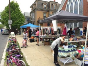 そして礼拝の帰り道、新聞に掲載された中で一番近所のブロックを目指して行くと…なんとまぁアチコチの家の前でガレージセールをやっているではないですか。写真のようなイメージのところもあれば、家の先にちょっとだけ出しているところもあったり…でも新聞や街のチラシを見て、目当てのものを見に来た人たちで賑わっていたよ。(写真引用:west-side-neighborhood-wide-yard-sale)