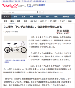 さらにこの記事を本日、あげようとした際にYahooニュース経由「朝日新聞Webニュース」にて、タンデム自転車についての報道がありました。記事によると鹿児島県内での公道走行が認められたとの報道でした(記事には画像をクリックすればジャンプします)。いいですね。
