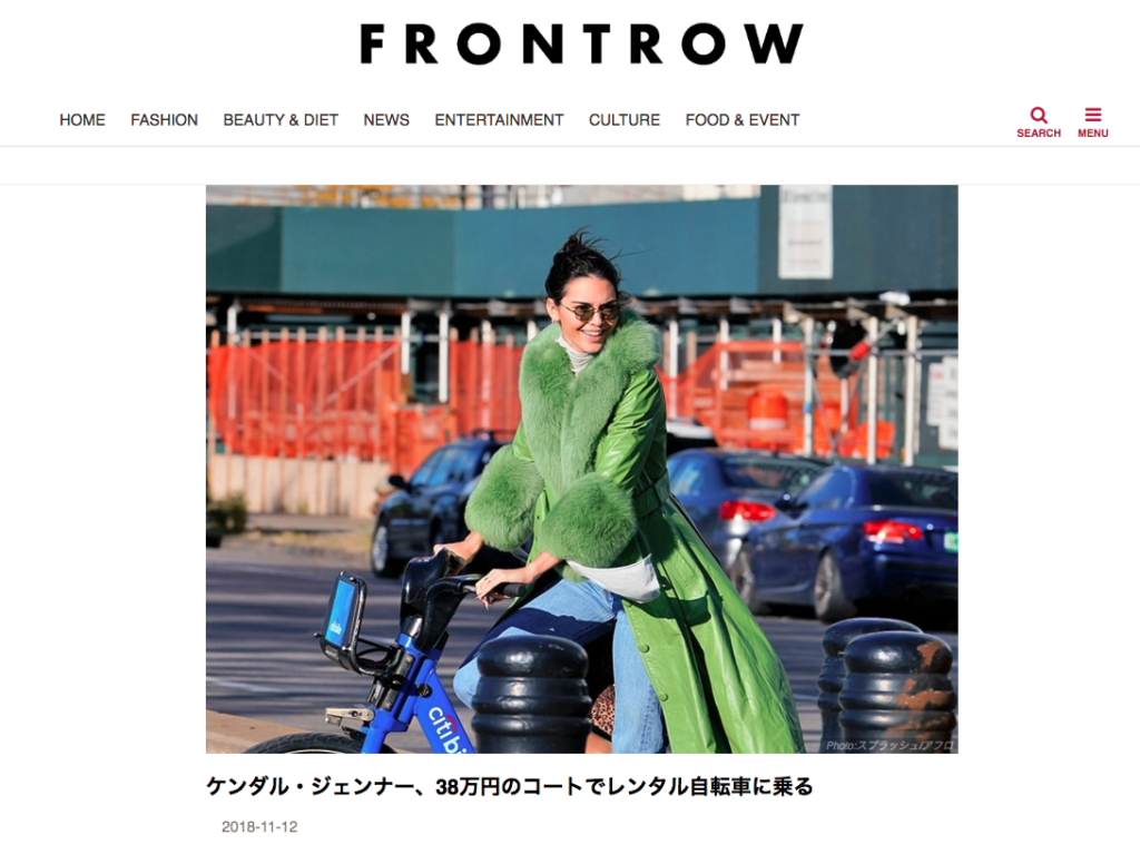 そんなケンダルさんもシェアサイクルを普段から利用するそうで、この度自転車に乗るケンダルさんの姿を写真に収めた記事がある。(H.P.「FRONTROW」より引用 / HP TOP画像をクリックするとジャンプします)