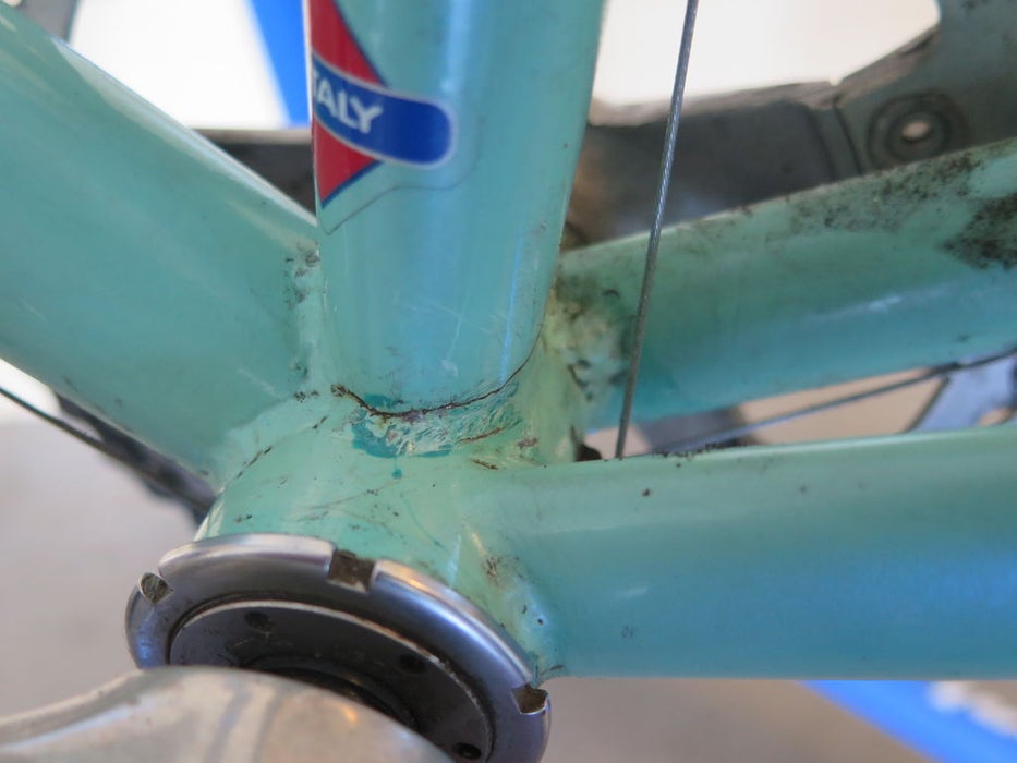 これはプロレース中の1カットですが、ヘッドチューブ周辺の損傷でしょう。ハンドルにかかるプレッシャーと、ペダリングによるパワーとの方向が、一気にヘッドチューブに集中して、ひねり破壊を起こしたのかな…と、思われます。