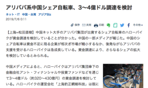 2.アリババ系中国シェア自転車、3~4億ドル調達を検討 (7/6付 日本経済新聞)