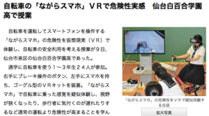 2.自転車の「ながらスマホ」VRで危険性実感 仙台白百合学園高で授業 (7/11付 河北新聞)