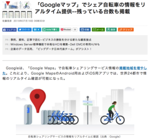 2.「Googleマップ」でシェア自転車の情報をリアルタイム提供–残っている台数も掲載 (7/19付 Cnet Japan)