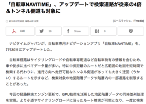 3.「自転車NAVITIME」、アップデートで検索道路が従来の4倍&トンネル側道も対象に (7/30付 IT media)