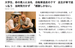 2. 大学生、命の恩人にお礼 自転車追走のクマ 店主が車で追っ払う 当時気付かず「感謝しかない」(8/2付 北海道新聞)