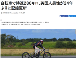 3.自転車で時速280キロ、英国人男性が24年ぶりに記録更新 (8/20付 CNN)
