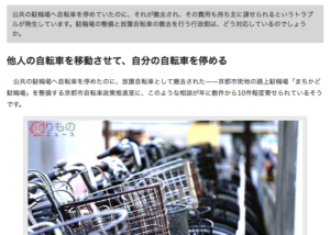 ー他人の自転車を移動させて、自分の自転車を停める…公共の駐輪場へ自転車を停めたのに、放置自転車として撤去された――京都市街地の路上駐輪場「まちかど駐輪場」を整備する京都市自転車政策推進室に、このような相談が年に数件から10件程度寄せられているそうです(続きはこちら)