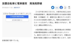 1.放置自転車に電車衝突 南海高野線 (8/24付 産経新聞)