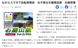 3.ながらスマホで自転車事故 女子高生を書類送検 兵庫県警 (10/1付 産経新聞)