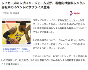 5.レイカーズのレブロン・ジェームズが、若者向け無料レンタル自転車のイベントにサプライズ登場 (1/23 Yahooニュース)