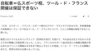 3.自転車=仏スポーツ相、ツール・ド・フランス開催は保証できない (5/6付 ロイター)