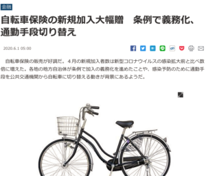 自転車保険の販売が好調だ。4月の新規加入者数は新型コロナウイルスの感染拡大前と比べ数倍に増えた。各地の地方自治体が条例で加入の義務化を進めたことや、感染予防のために通勤手段を公共交通機関から自転車に切り替える動きが背景にあるようだ…(続きはこちら)